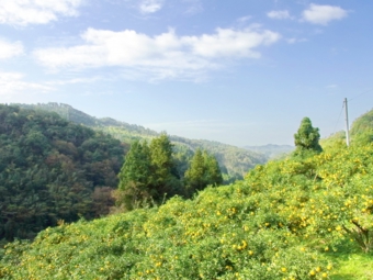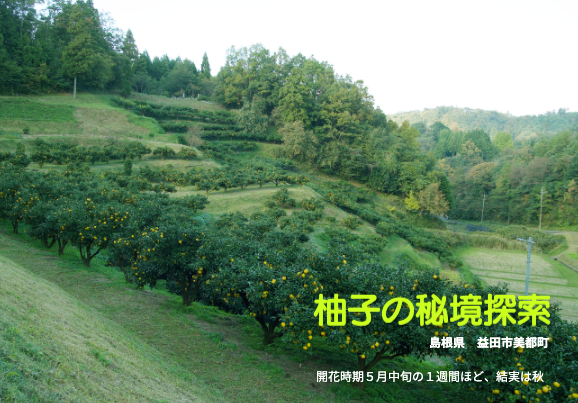 島根県益田市から東へ、かつては秘境として人を寄せ付けない山間部に柚子畑が広がっています。5月の連休明けに開花し、11月に実ります。