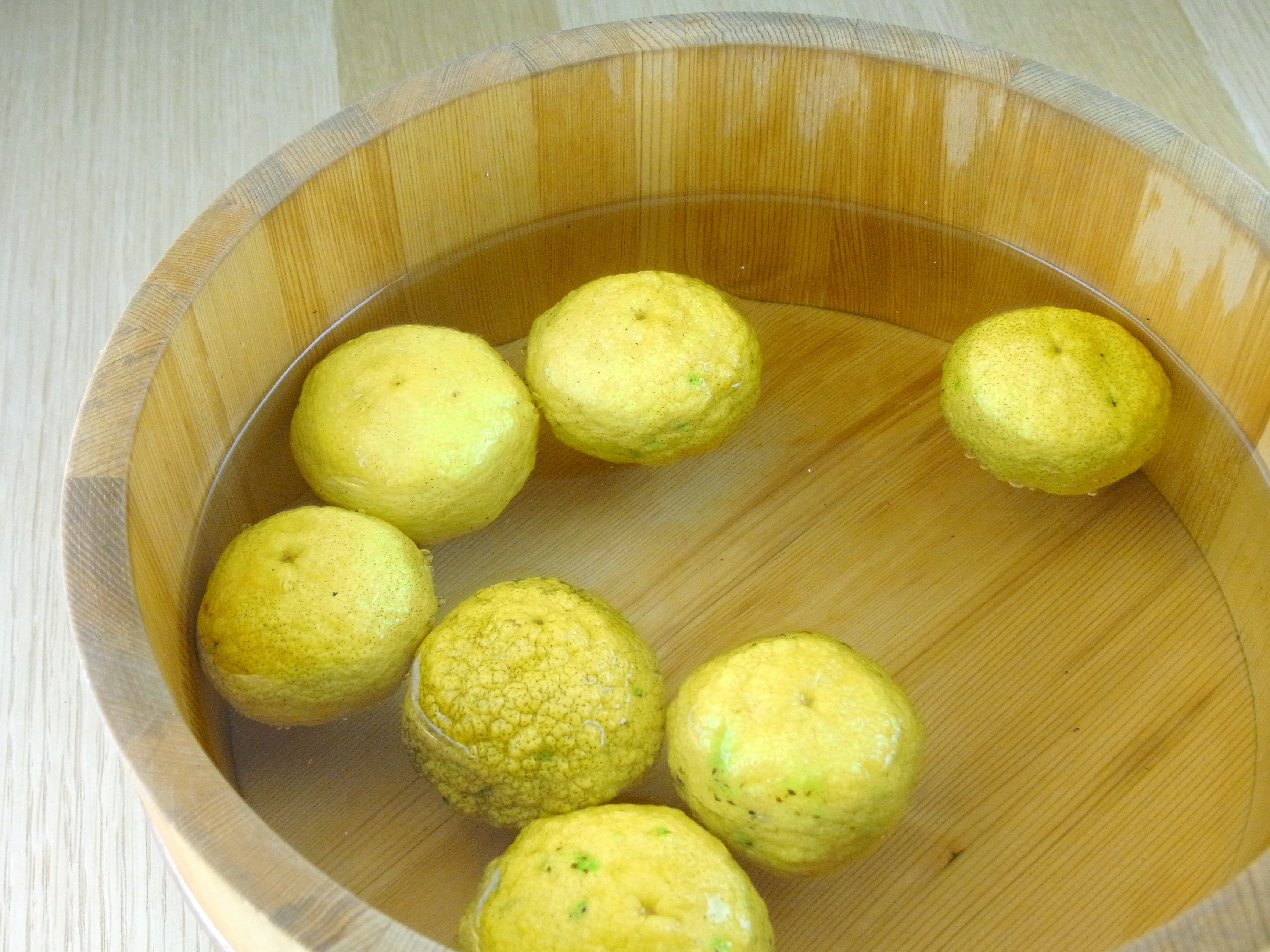 柚子の最盛期頃、冬至の柚子風呂を楽しみましょう。柚子の果皮の裏側白い綿上の繊維はお肌をすべすべにしてくれます。お風呂の中で角質を擦るとしっとりとします。