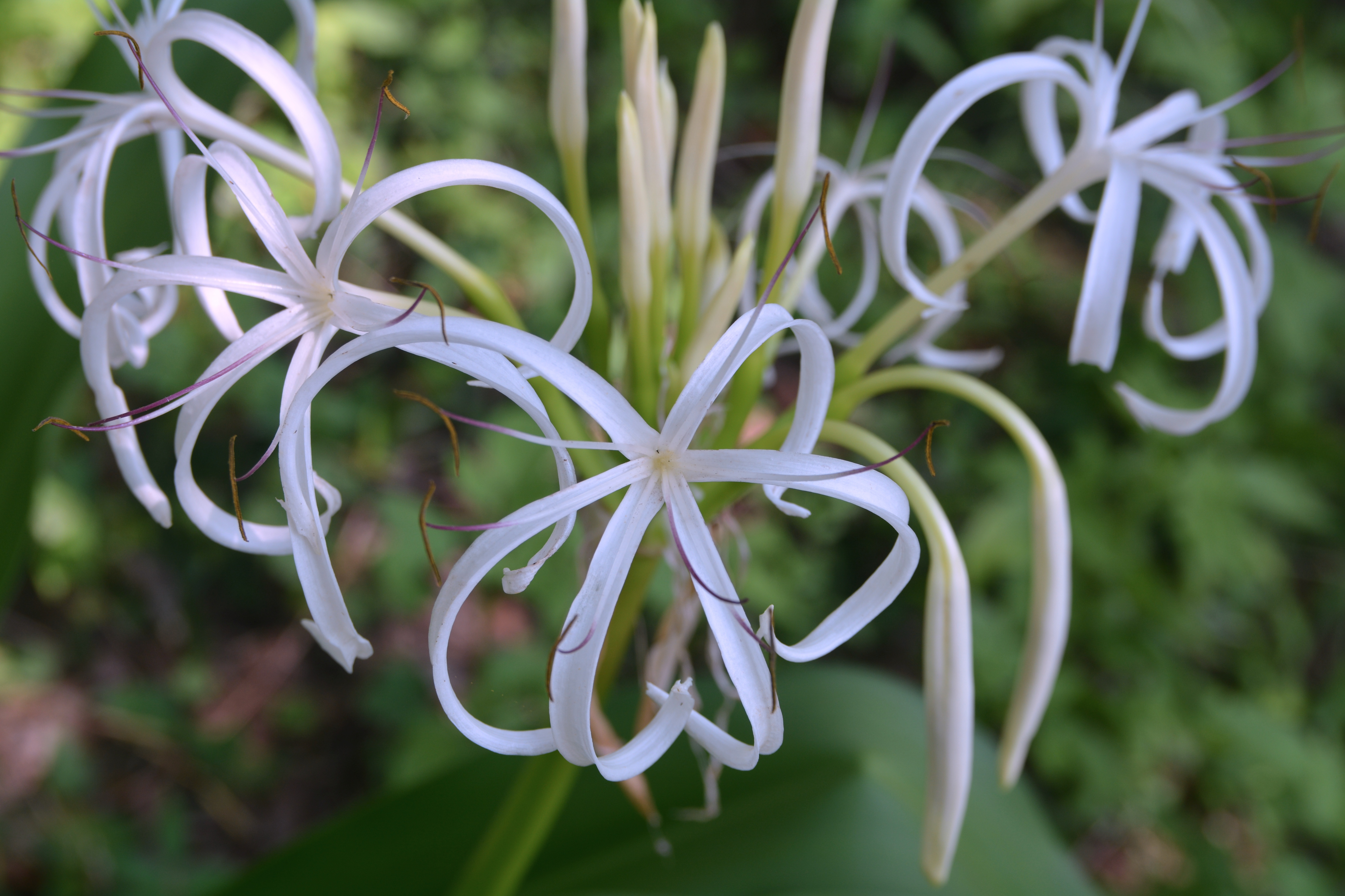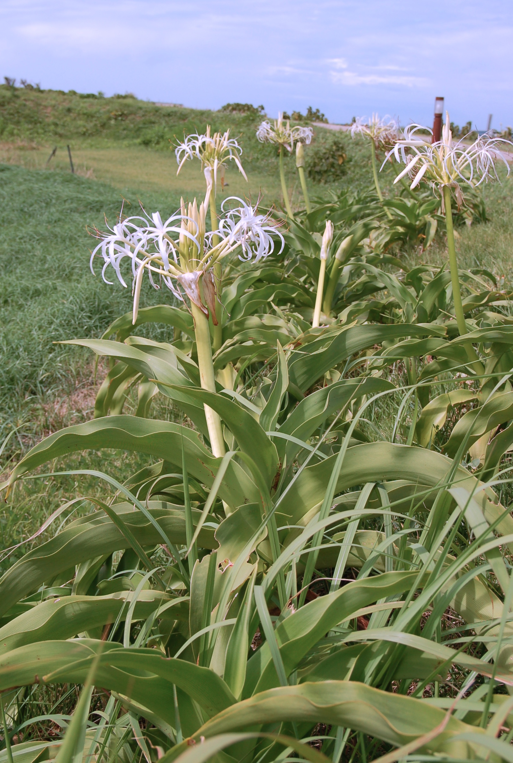 温暖な南日本の海浜で見かける花。夕暮れから香りが拡がる夏の花。秋の田畑で見かける真っ赤な彼岸花(ひがんばな)の仲間で花は白です。