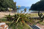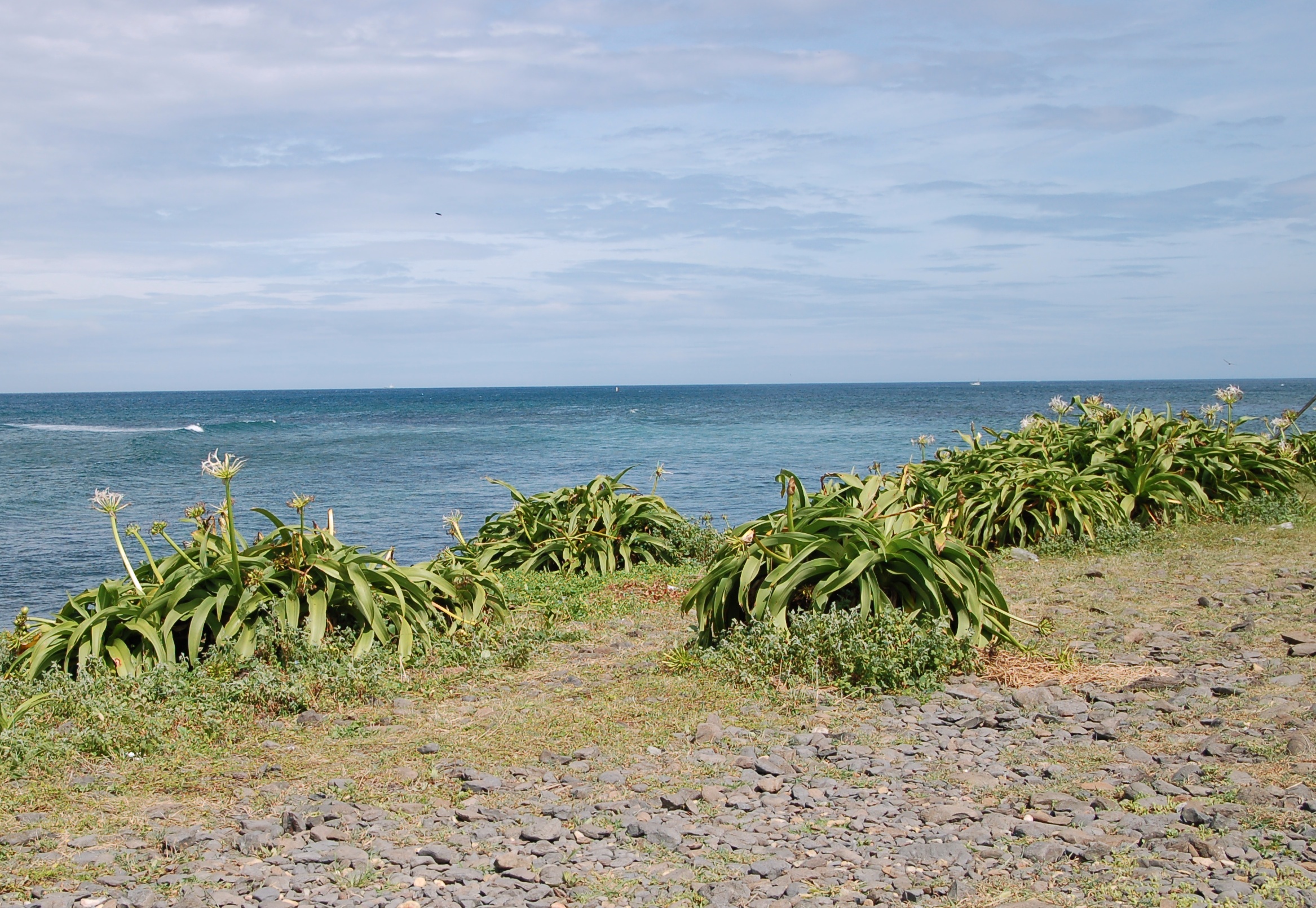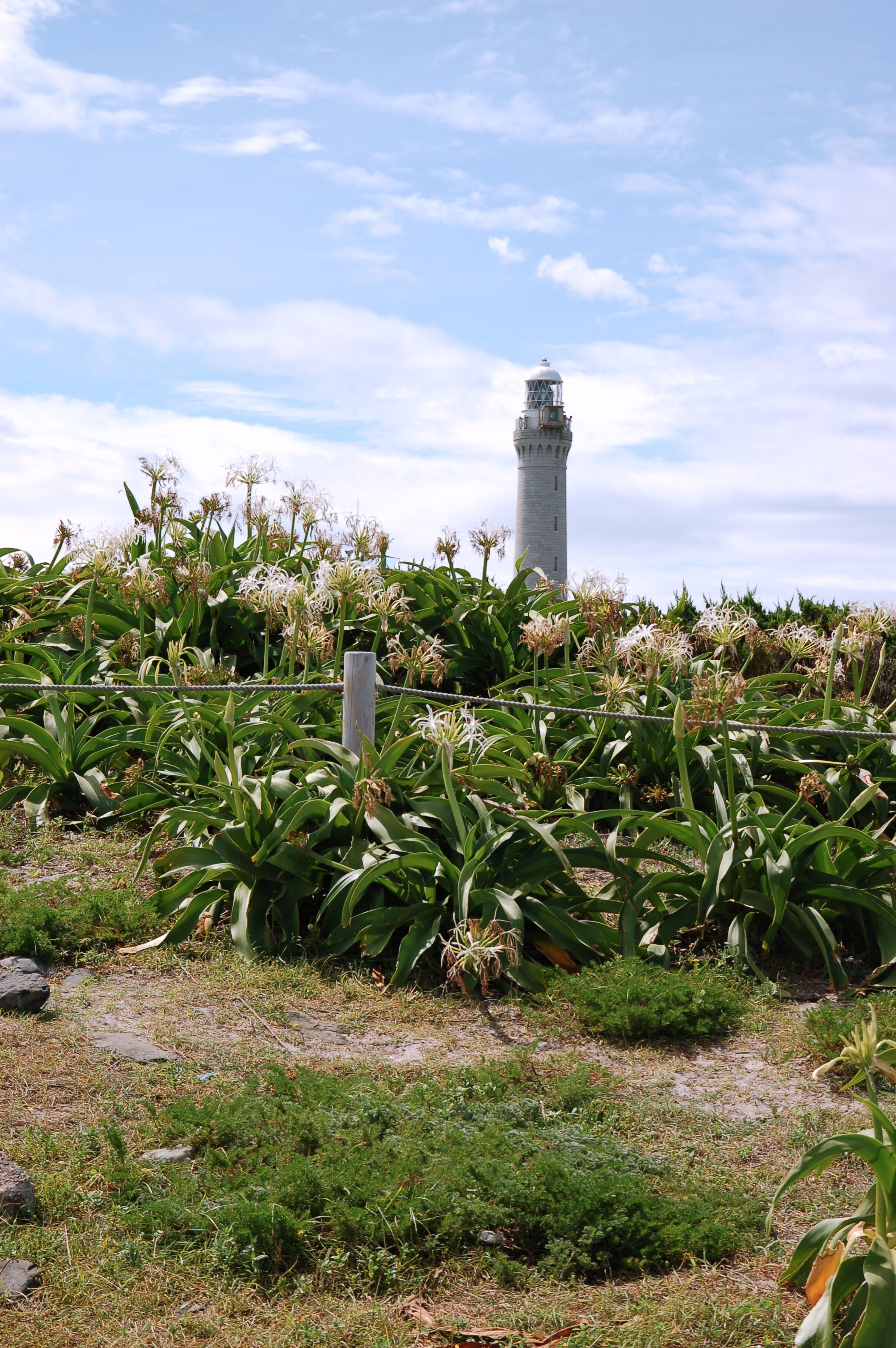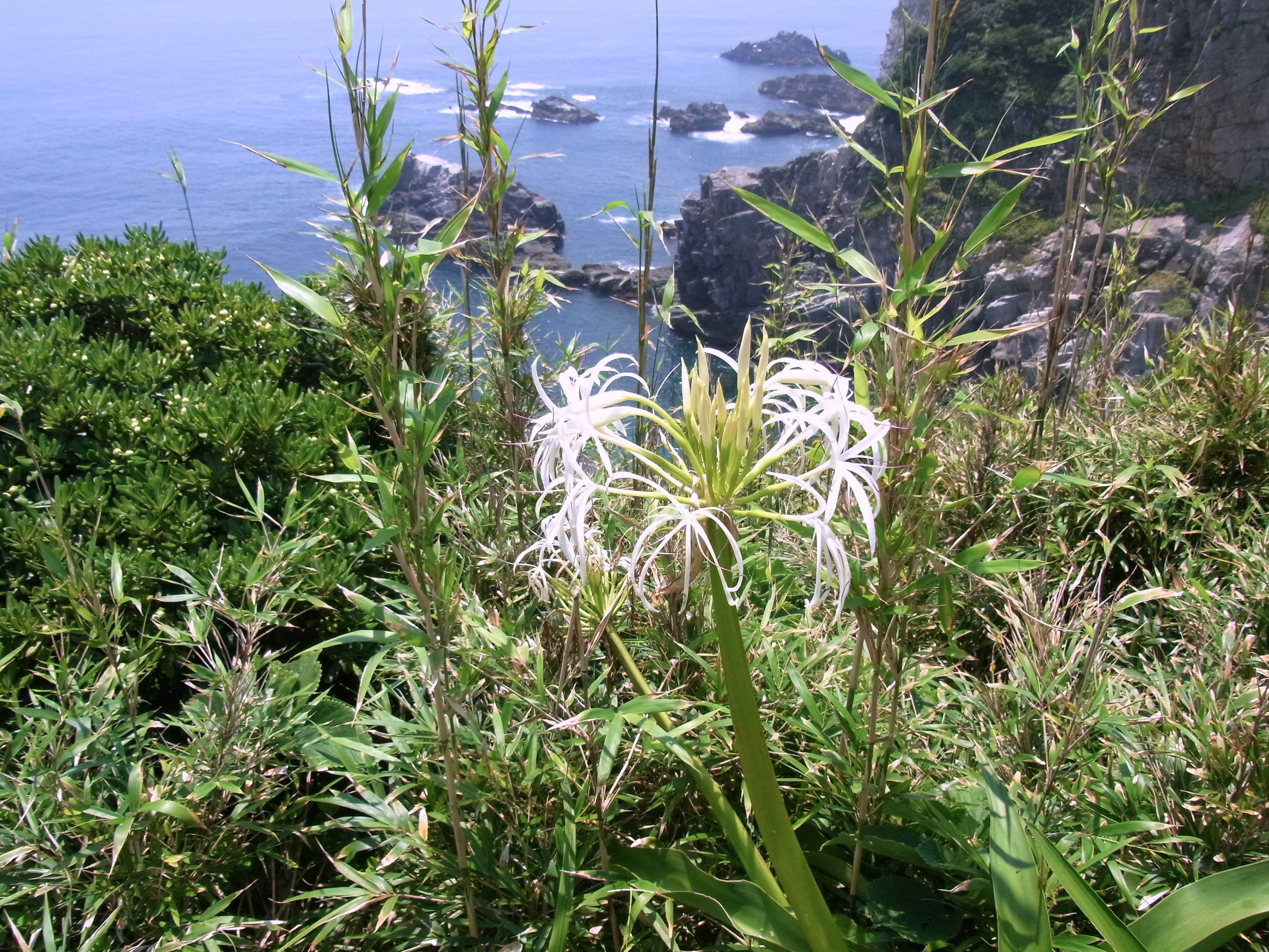 個人的には灯台に最も似合う植物と思っています。南日本の海岸には南方から種や株が海流で運ばれる植物が多くあります。ハマユウの他にも有名な椰子(ビロウ)、アオイ科のオオハマボウ、グンバイヒルガオ、アダン、クワズイモなどと漂着種子たちの海を超えたツワモノの姿に対峙できます。