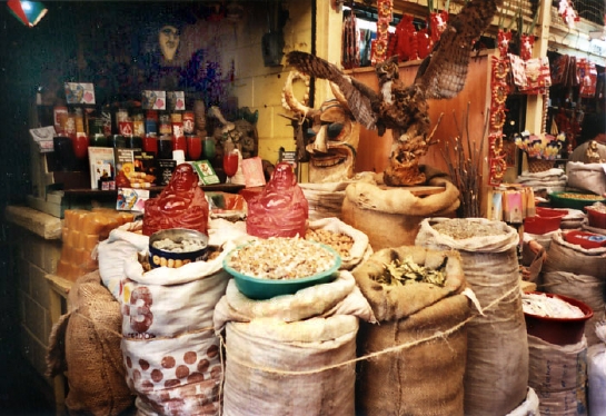 首都メキシコシティーの外れに、人知れずソノーラマーケットと呼ばれるネイティブ向けの薬草やナチュラルグッズの市場は、日本でほとんど見かけない薬草や 香木、樹脂、薪、香油、呪術グッズに溢れています。中でも、魔術師が儀式に使用するアイテムは、写真を撮るのも恐れ多く凄んでしまうもの(干しコウモリ) もあり、とても興味深い場所です。