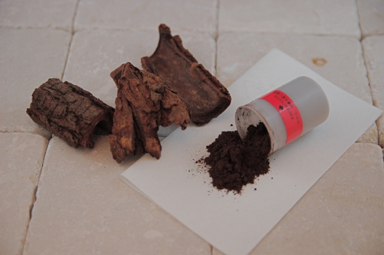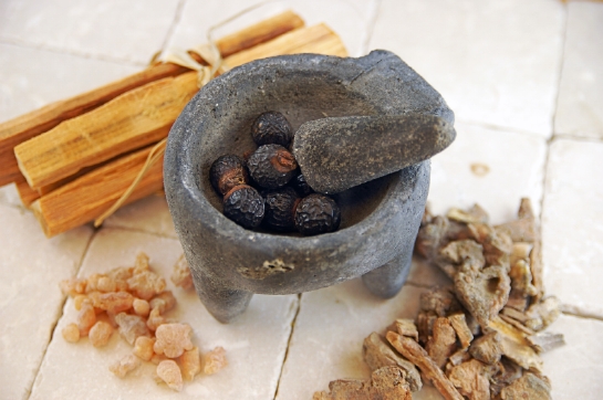 土産に買った乳鉢、中はホホバの実。後ろの樹脂を含んだ木片は煮込んで蜂蜜を加えると咽の薬になるとか。手前は、コパル(ミルラ:樹脂)とその樹皮。