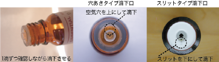 市販されている精油瓶は滴下口になっており一滴ずつ滴下しますので、使用時は瓶を45度に傾けて一滴ずつ滴下させて用います。一気に精油が飛び出さないようにできています。滴下口は直接触れたりしないで下さい(雑菌や不純物が付着して精油の劣化を早めます)。